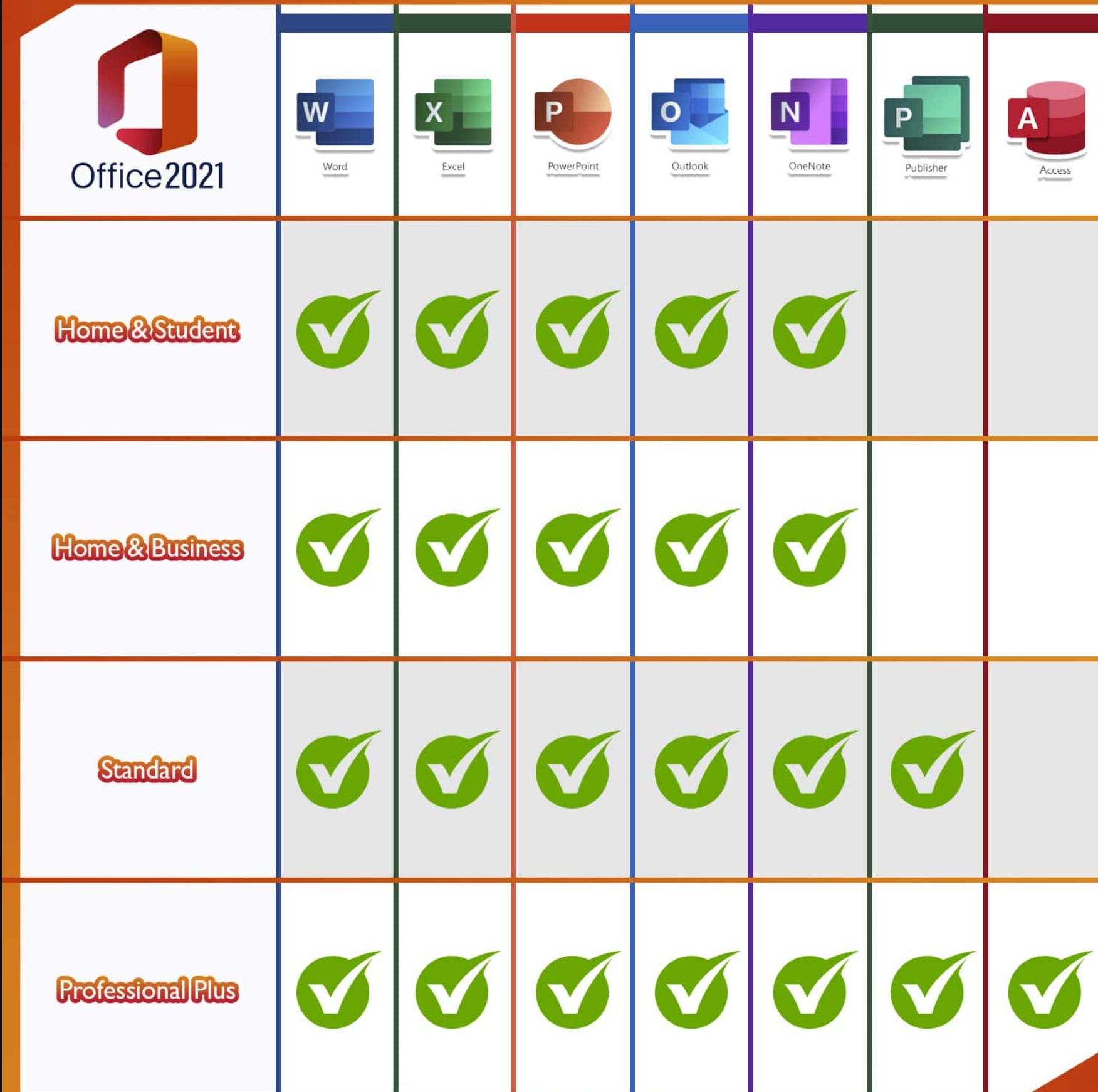 Complete suite including Access for database management and Publisher for professional publishing – features not available in standard versions.